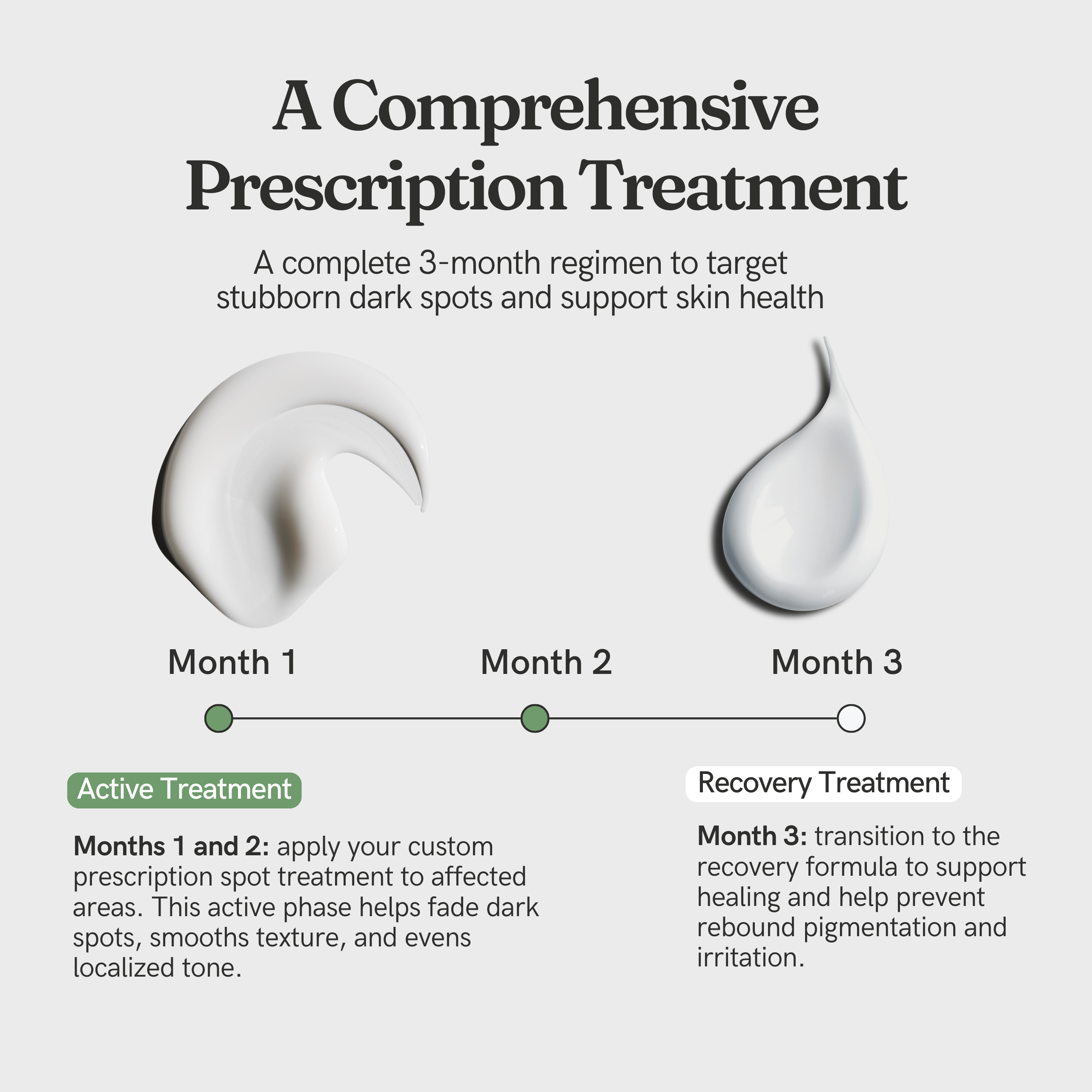 A 3-month regimen for stubborn, localized dark spots. Includes 2 months of high-strength spot treatment and 1 month of recovery care to support healing and prevent rebound pigmentation.